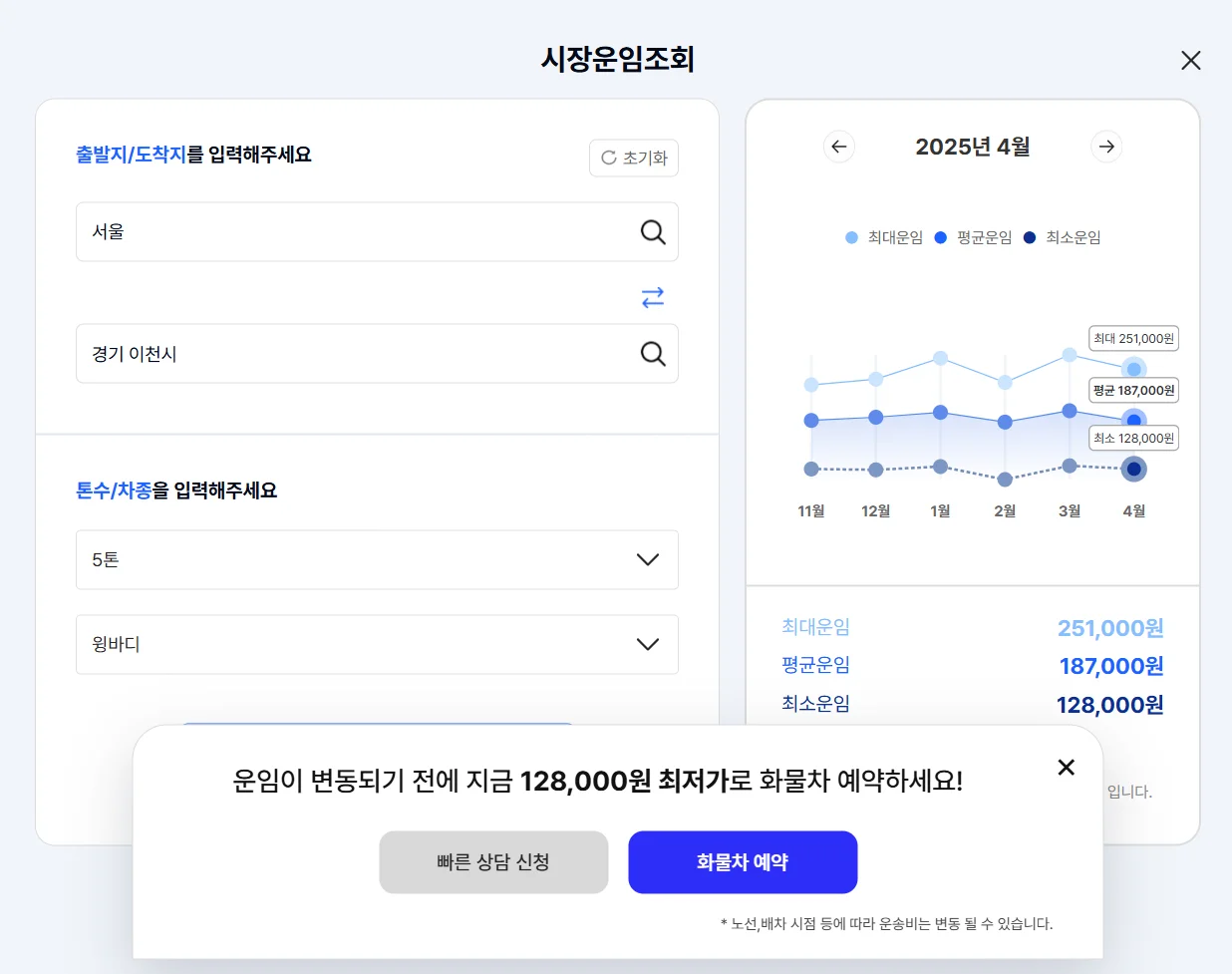 명절 전후, 연말연시, 특정 업종 성수기에는 차량 수요 급증으로 운임이 상승합니다. 당일 긴급 배차도 마찬가지입니다.