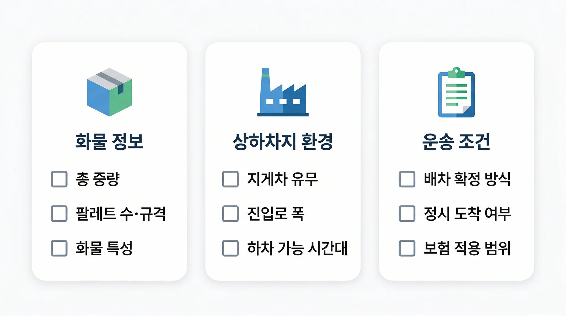 단건 운송은 조건을 한두 가지라도 빠뜨리면, 현장에서 추가 요금이 붙거나 배차 자체가 취소되는 일이 생기기 쉽습니다. 체크리스트를 통해 사전에 반드시 확정해야 할 항목을 확인해보세요.
