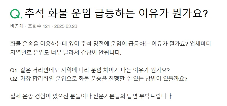 추석 성수기를 포함해 연말 시즌은 화물 운송의 수요가 공급보다 훨씬 많으므로, 운임 책정에 있어 화주사의 가격 협상력이 크게 떨어집니다. 특히, 한 곳의 운송사만 이용하고 있다면 다른 선택지가 없기 때문에, 아무리 비싼 가격을 불러도 받아들일 수밖에 없습니다.